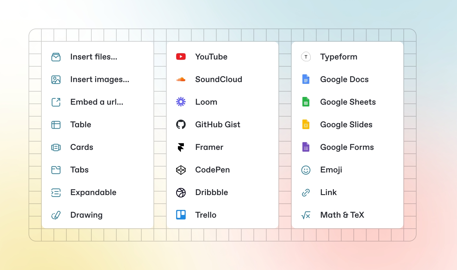 Each tab is like a mini page — it can contain multiple other blocks, of any type. So you can add code blocks, images, integration blocks and more to individual tabs in the same tab block.